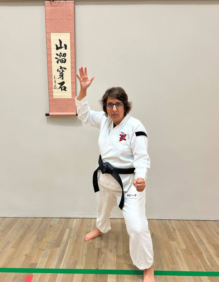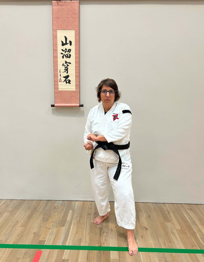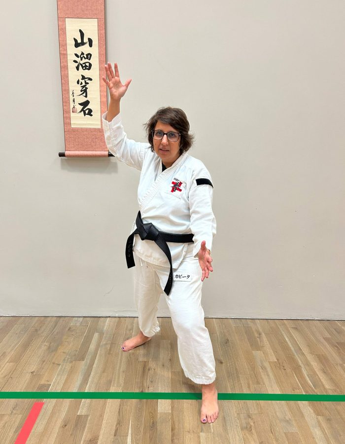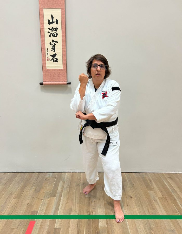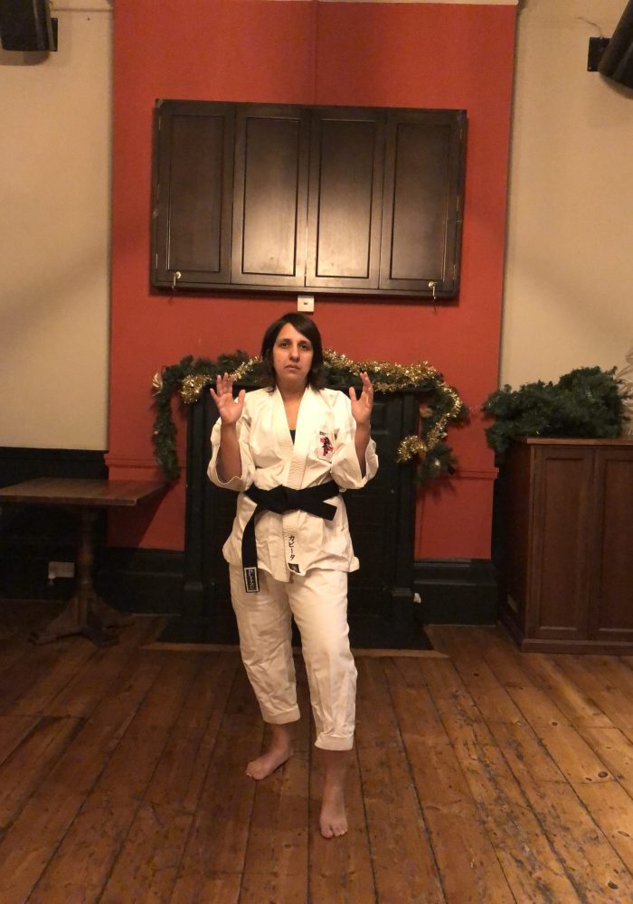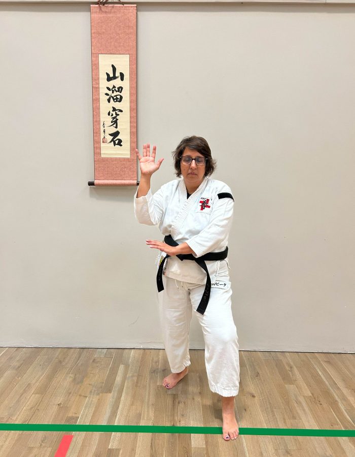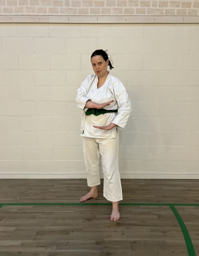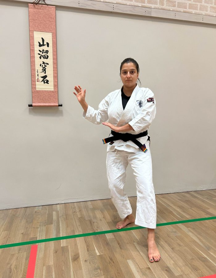 Both hands open, front hand high around the shoulder and back hand in front of chudan. This stance invites an attack to the head. Sensei Kavita’s preferred stance is to have her ankle raised so that you can stamp down when you turn. Taiki gamae, which is basically saying to an oponent, “Look at my head! Totally open for business!”.