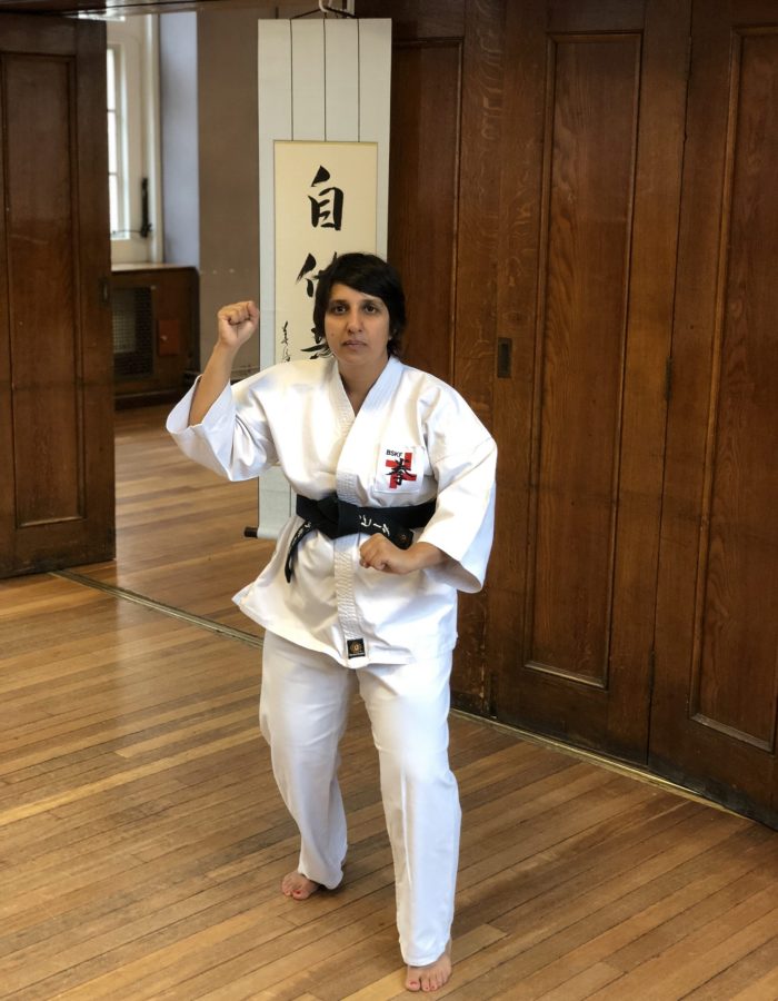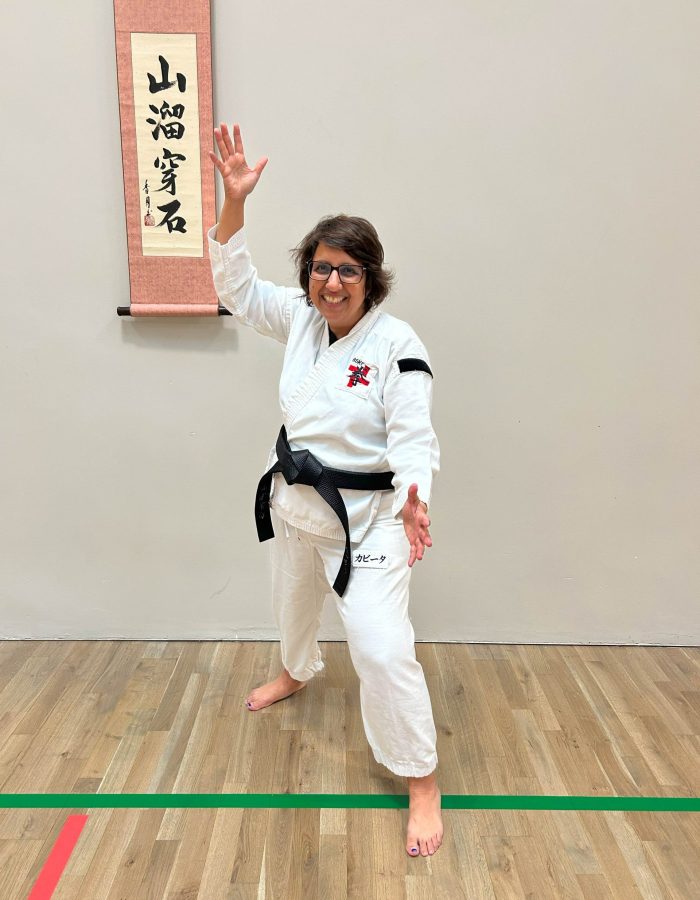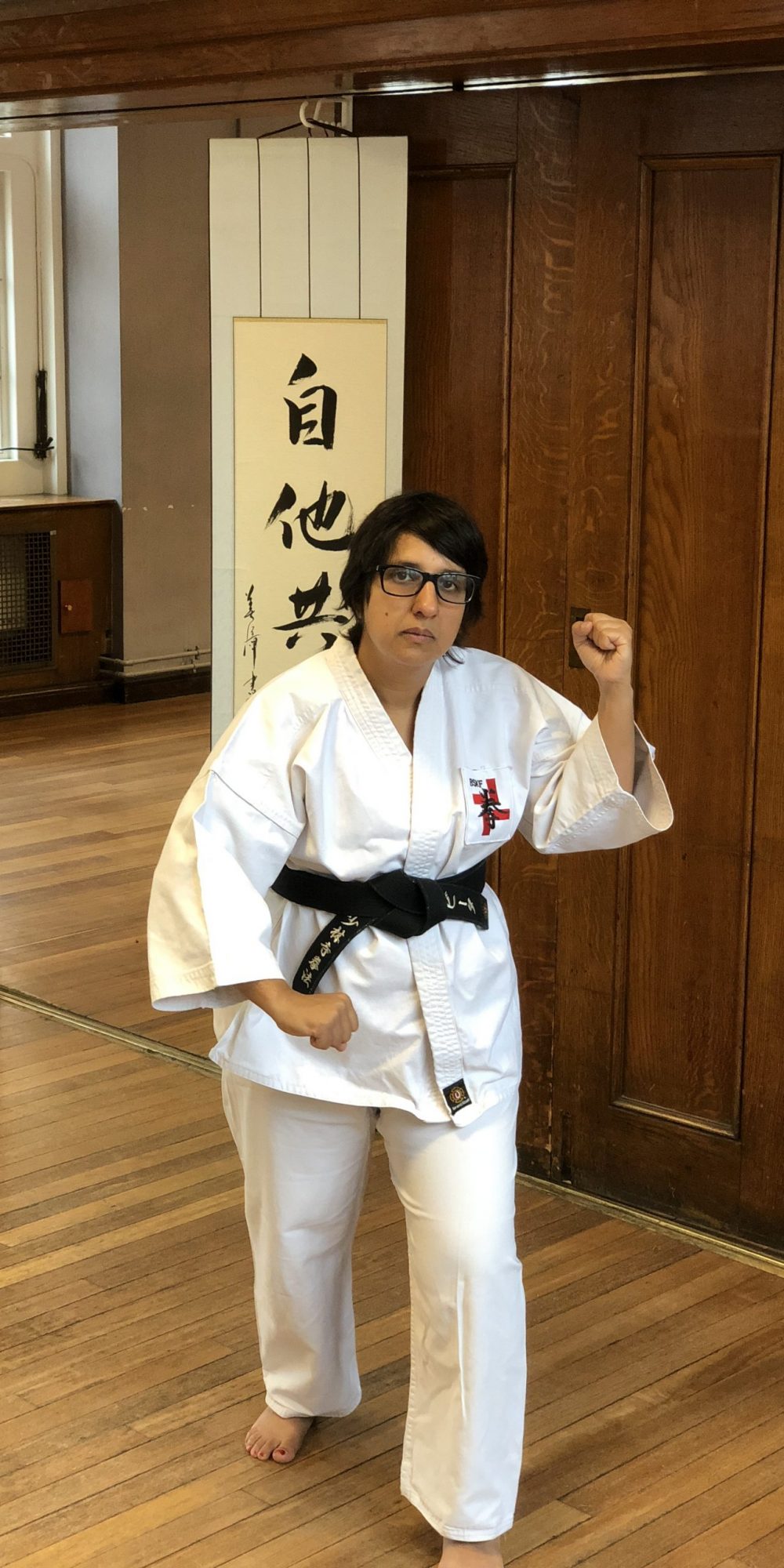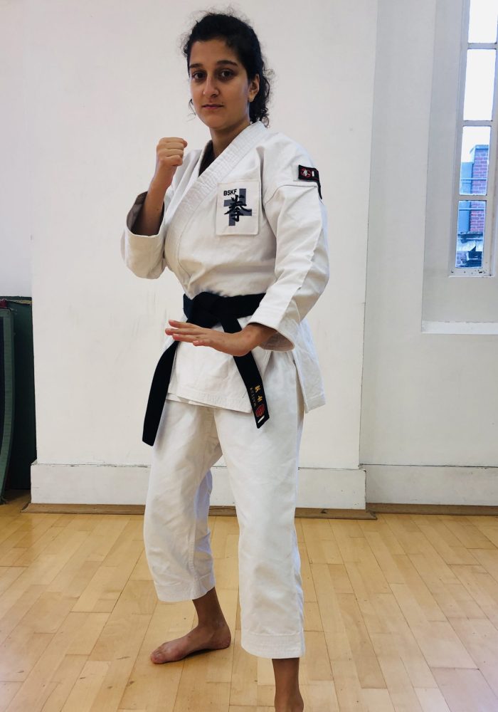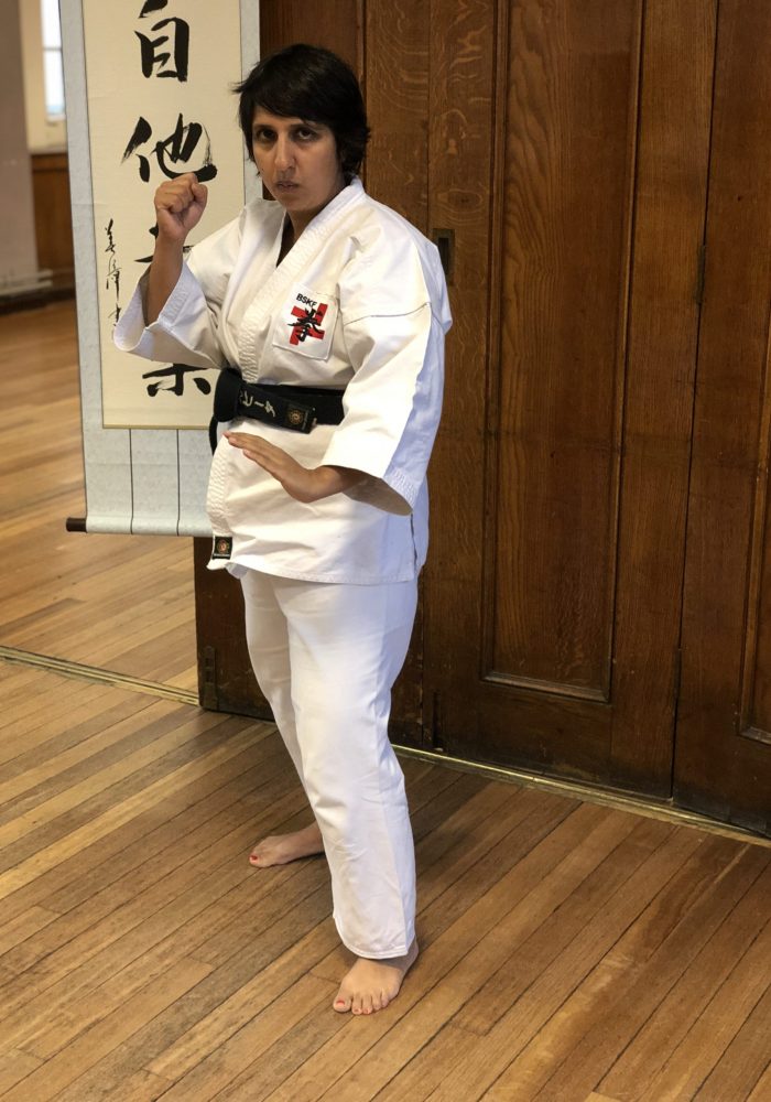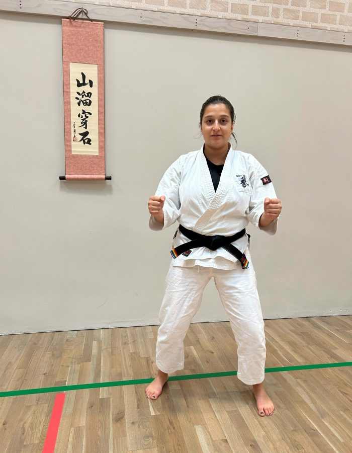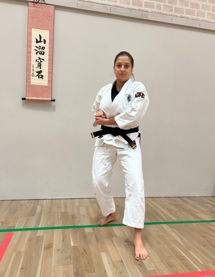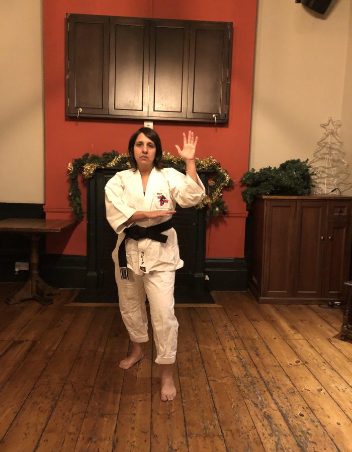 Both hands open, front hand high around the shoulder and back hand in front of chudan. This stance invites an attack to the head. Sensei Kavita’s preferred stance is to have her ankle raised so that you can stamp down when you turn. Taiki gamae, which is basically saying to an oponent, “Look at my head! Totally open for business!”.