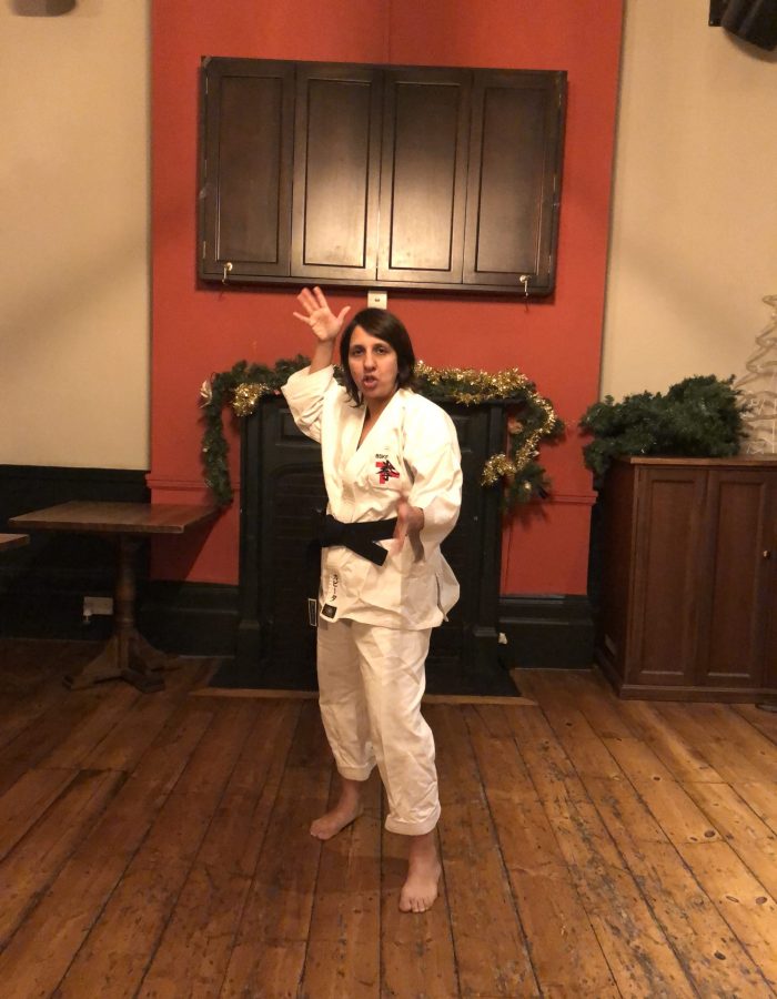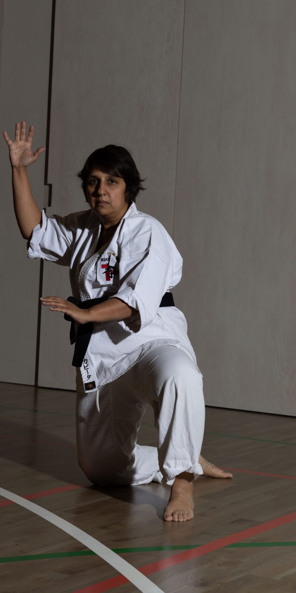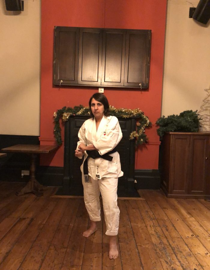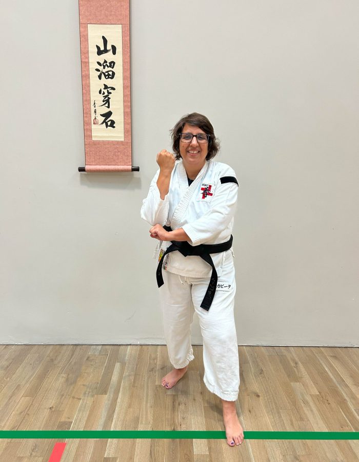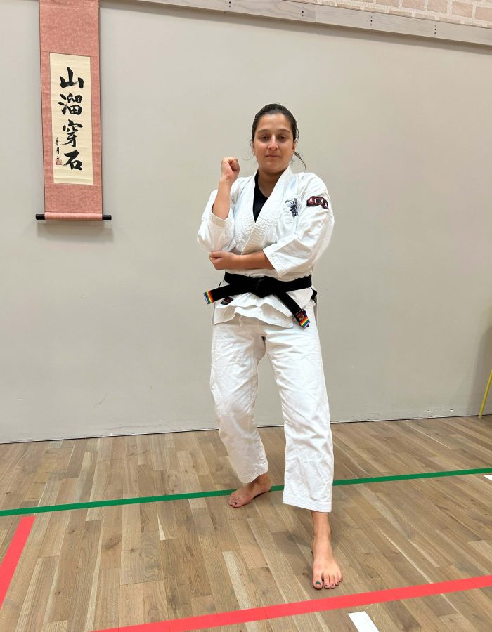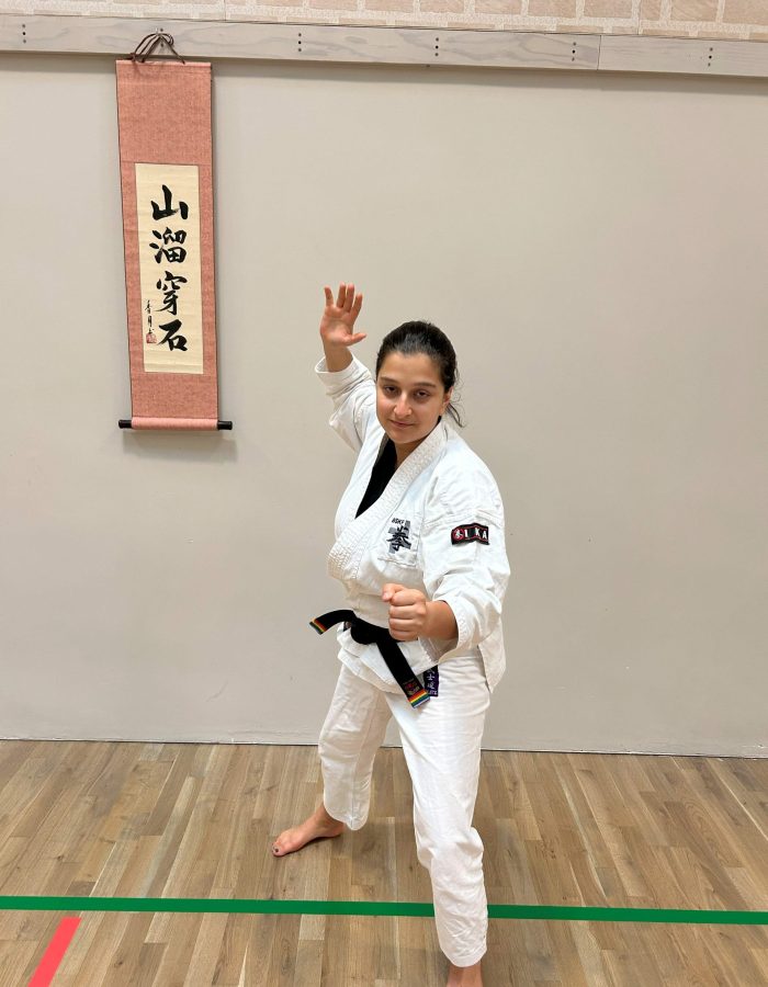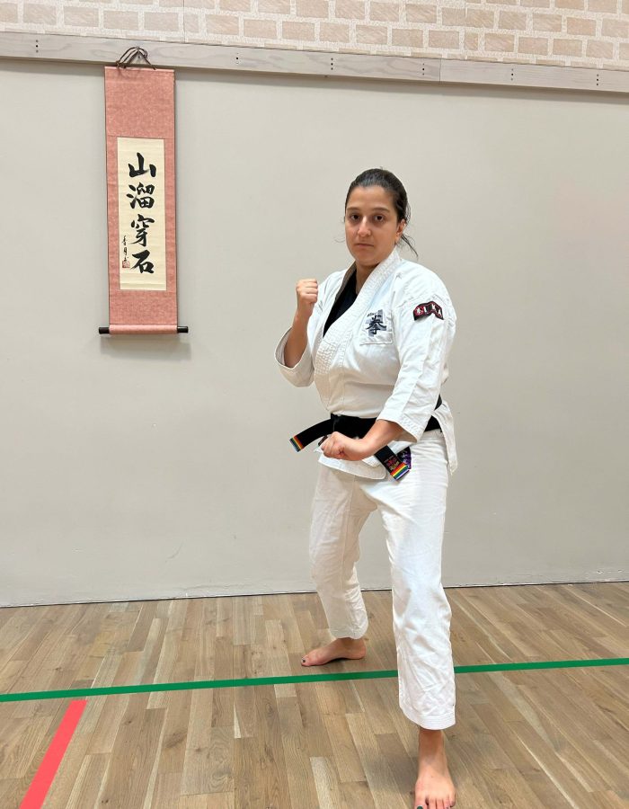 Both hands open, front hand high around the shoulder and back hand in front of chudan. This stance invites an attack to the head. Sensei Kavita’s preferred stance is to have her ankle raised so that you can stamp down when you turn. Taiki gamae, which is basically saying to an oponent, “Look at my head! Totally open for business!”.