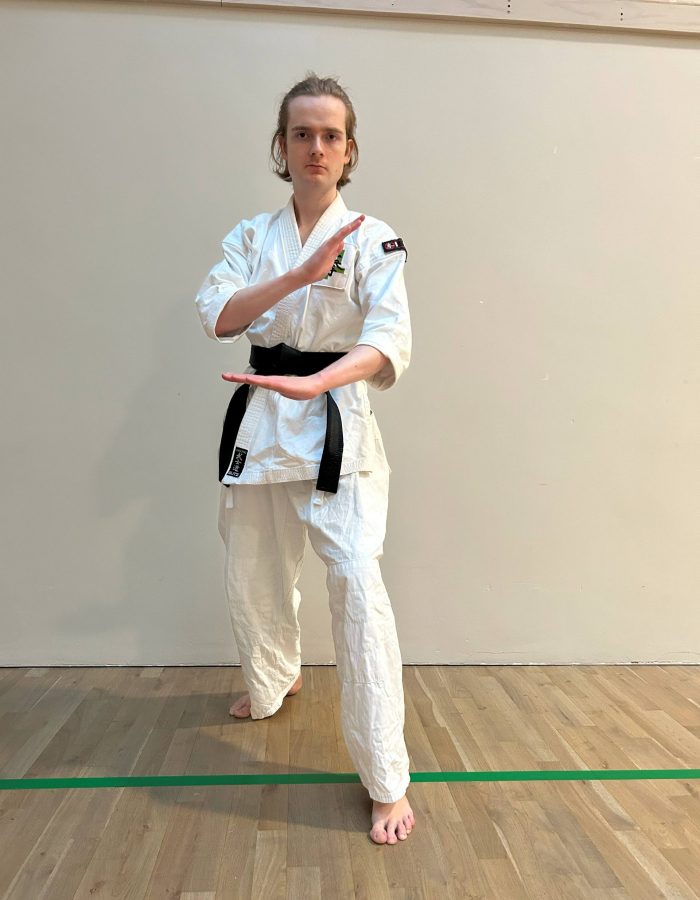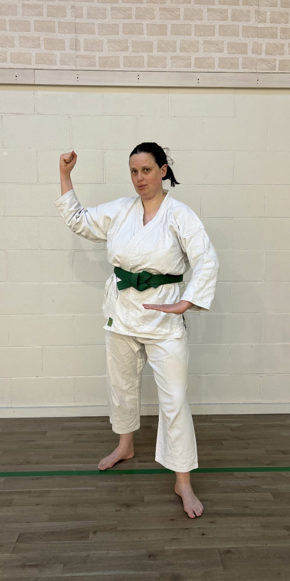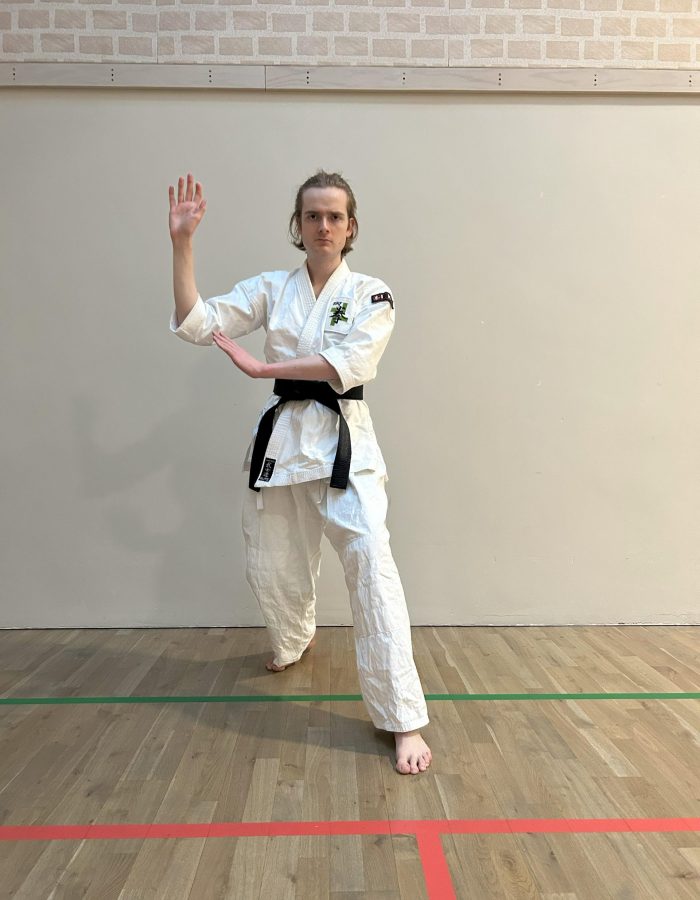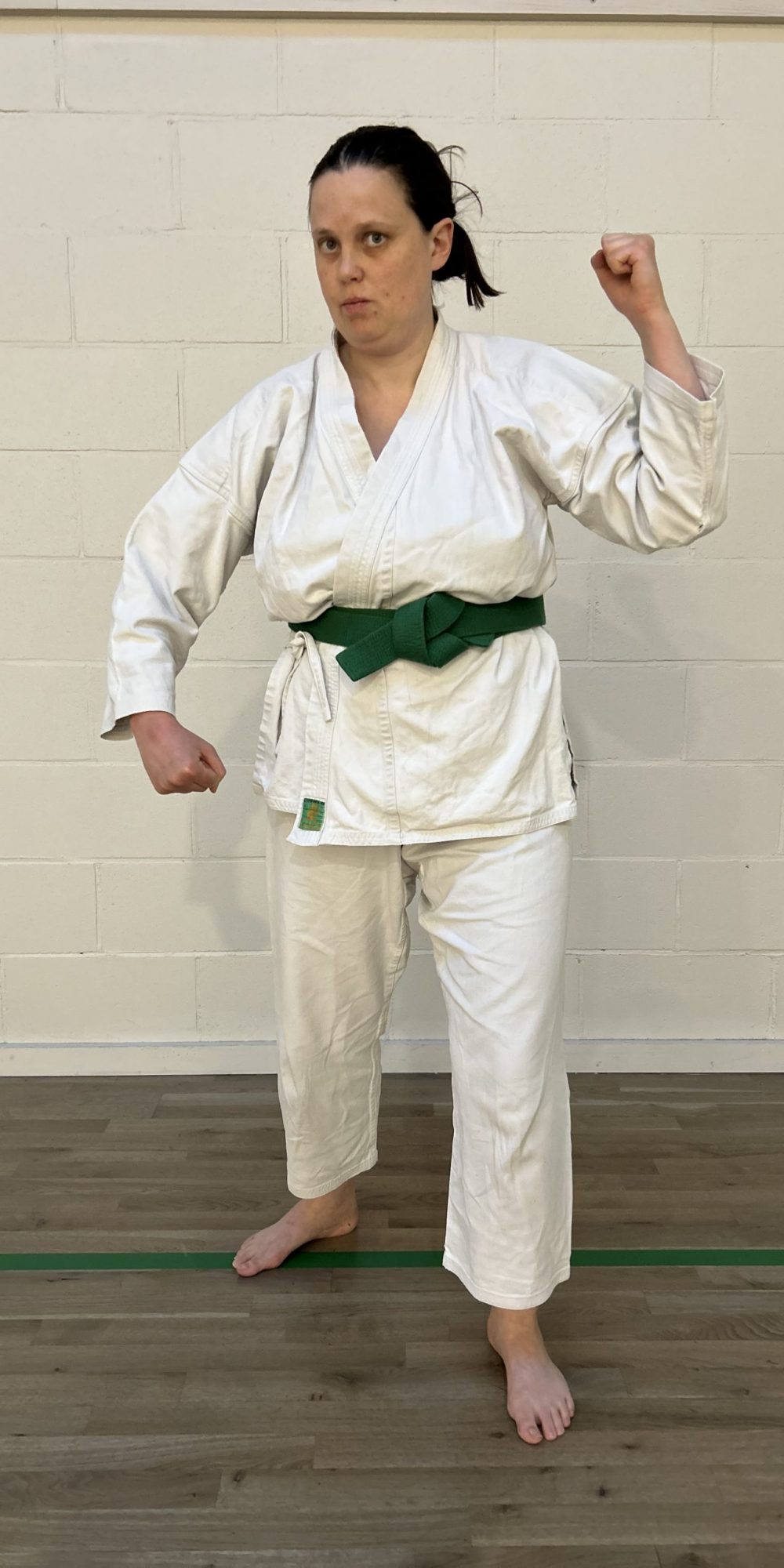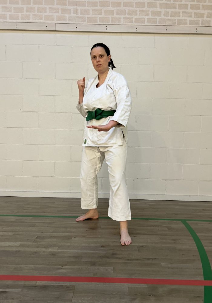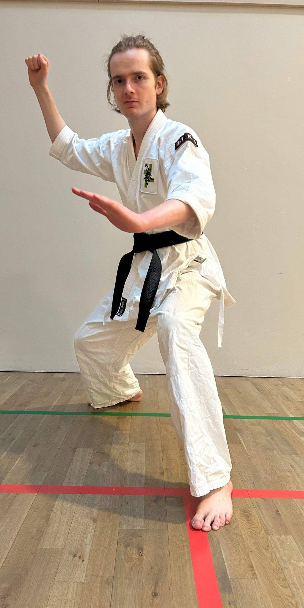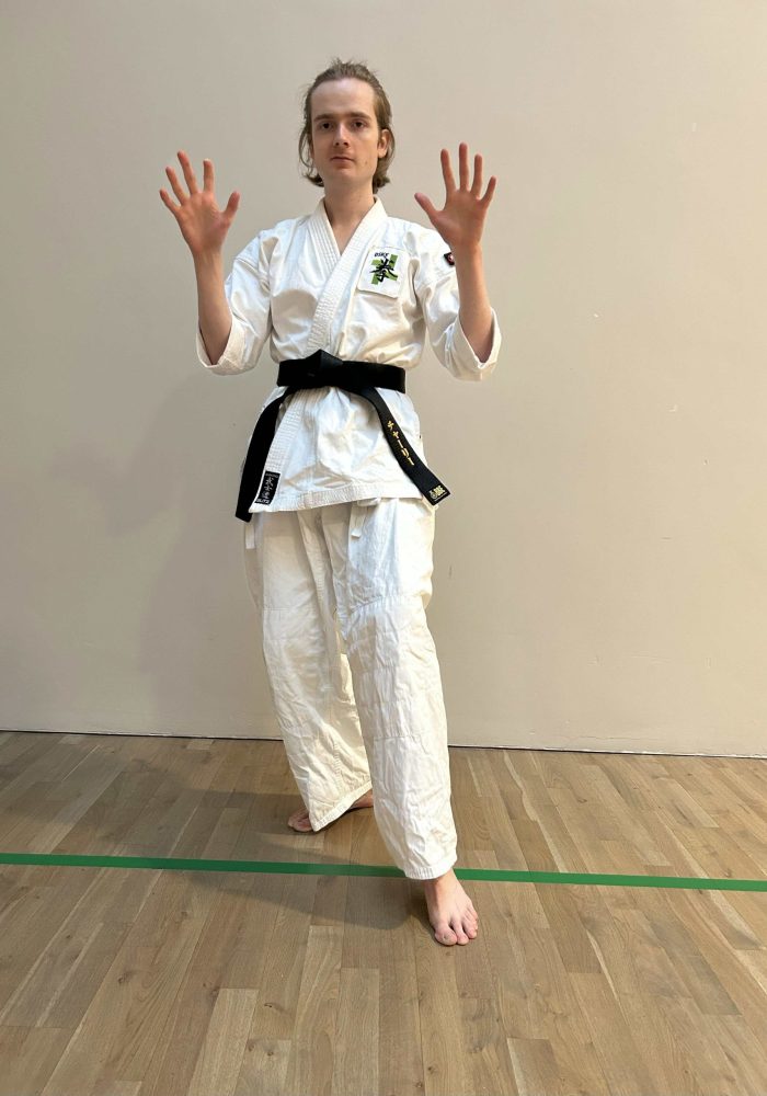 Weight is shifted backwards. Back arm is held high with raised fist, forward hand is held open in front of the belt.