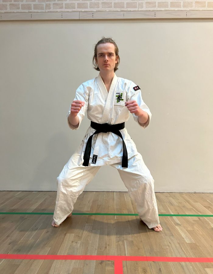 All our following stances can be done with either the right foot forward for migi, or left for hidari . Knees are slightly bent. Where not stated, then the feet are set shoulder width apart with the front foot turned in about 10° and the rear foot turned out about 45°.