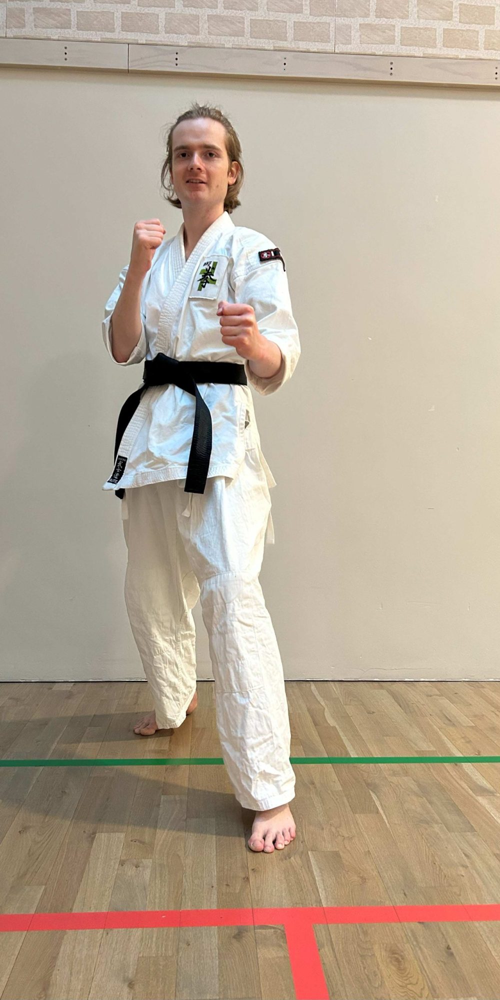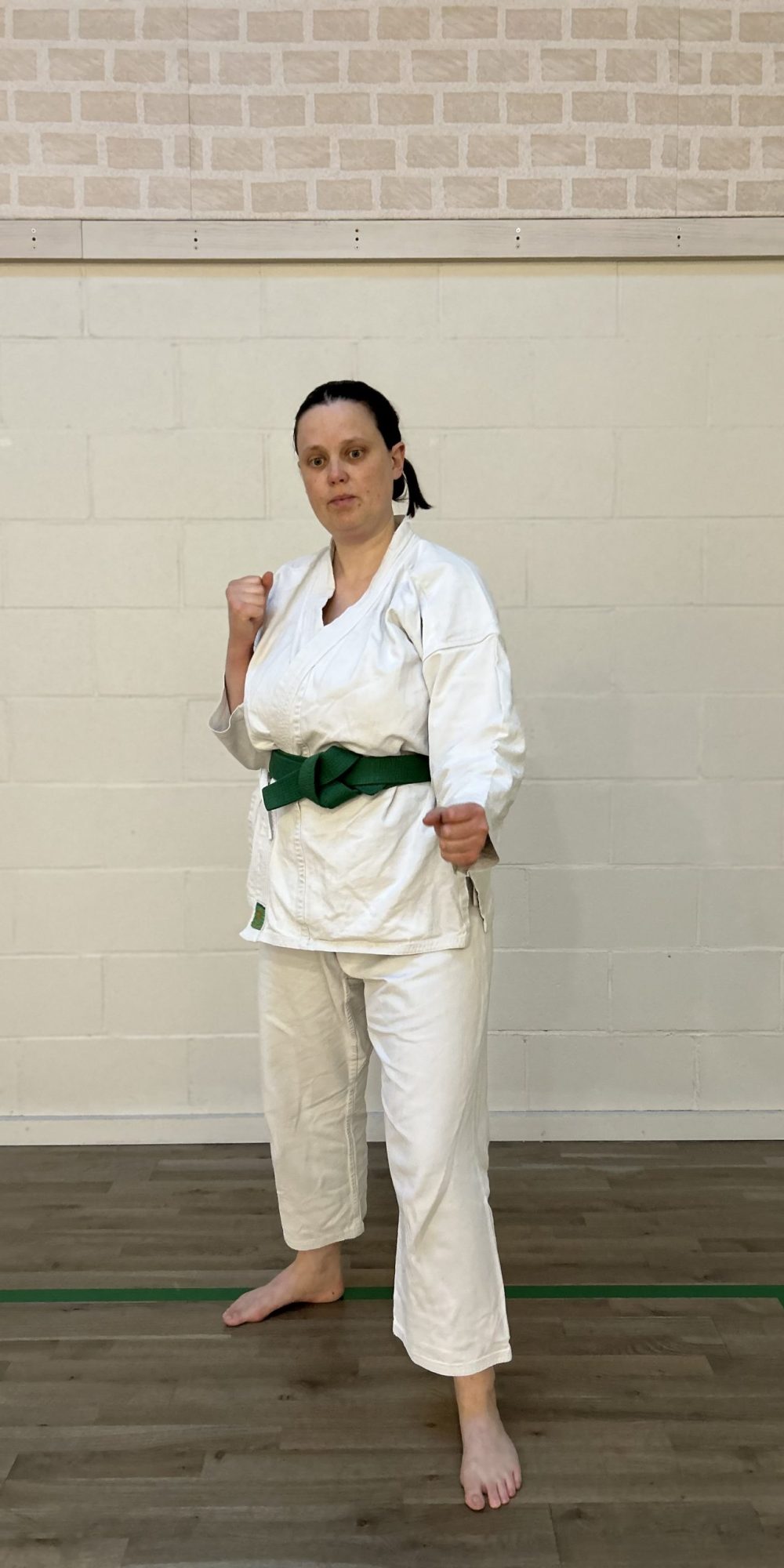 This is our normal training stance in which the feet are parallel. The hands are in fists and placed in front parallel to the ground.