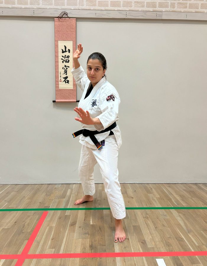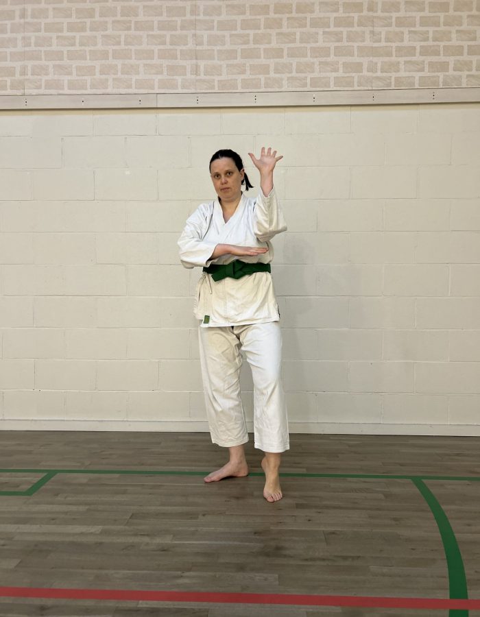 Both hands open, back hand high around the shoulder and front hand in front of chudan. This stance invites an attack to the head. Sensei Kavita’s preferred stance is to have her ankle raised so that you can stamp down when you turn. Reverse Taiki gamae.